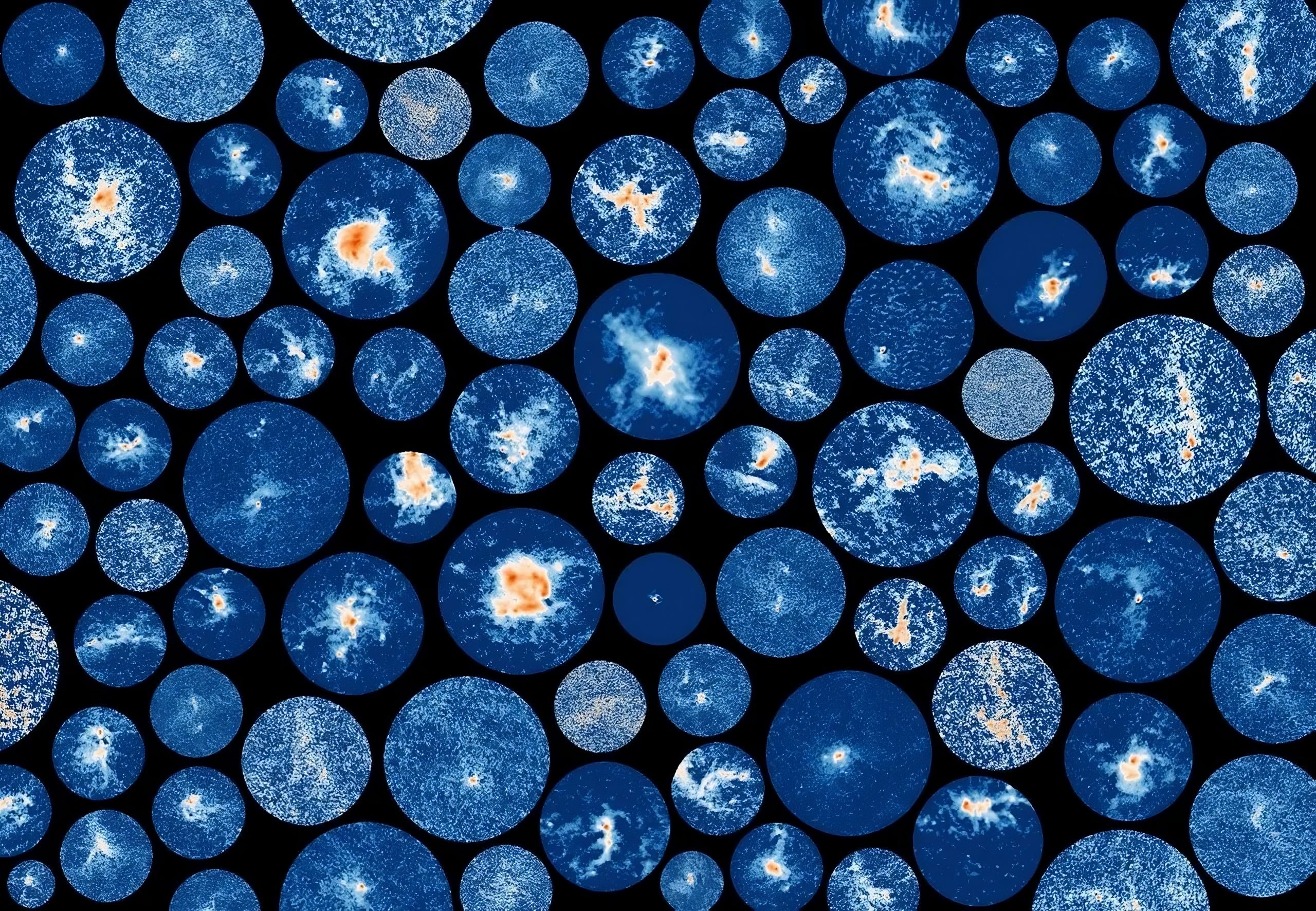 Un collage di alcune fra le più di mille regioni di formazione stellare osservate in Almagal. Le immagini rappresentano l’emissione termica della polvere fredda nel continuo alla lunghezza d’onda di 1,38 mm. Crediti: Eso/Alma/AlmaGal/C. Mininni