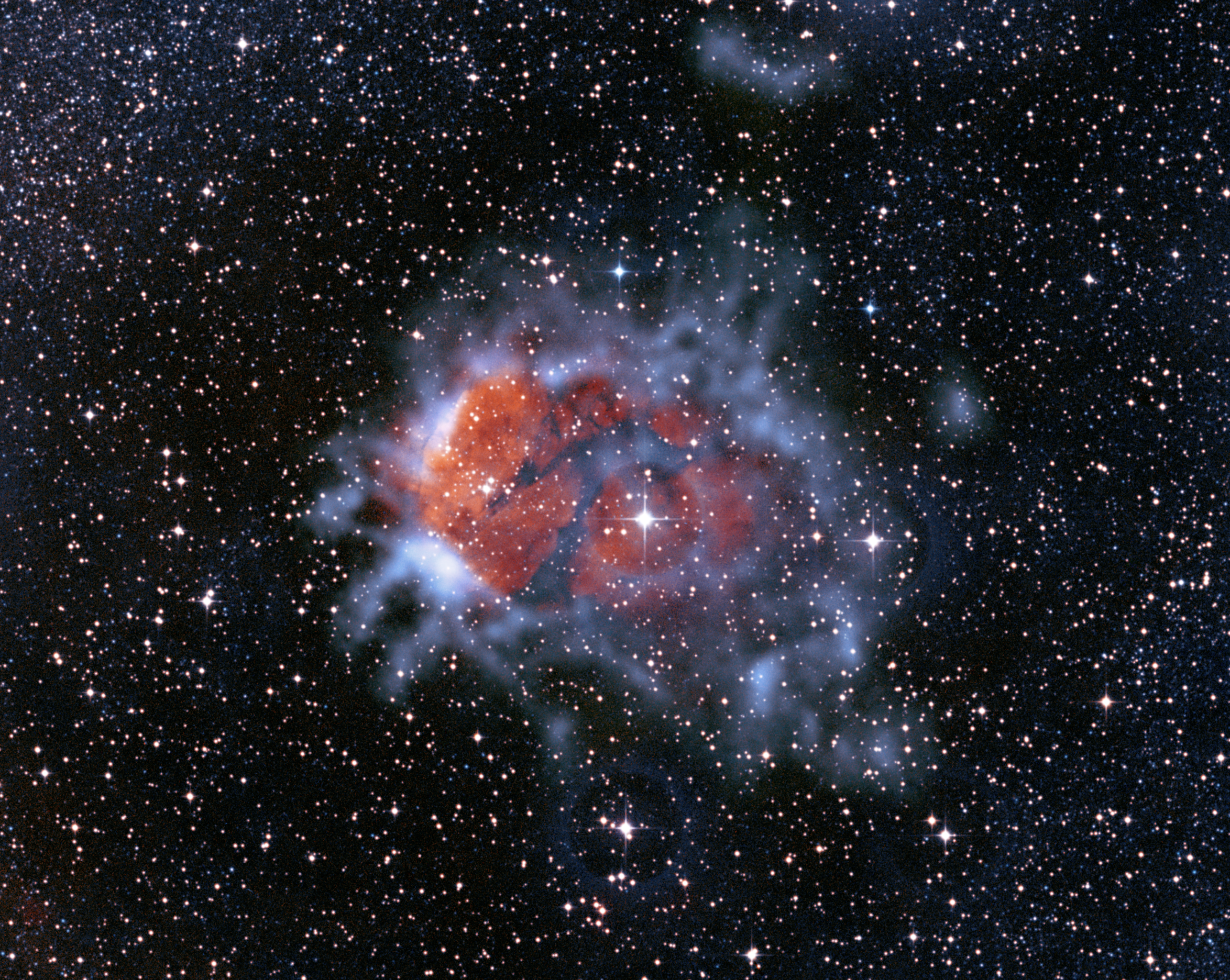Una bolla di gas ionizzato in espansione, larga circa dieci anni luce, sta causando il collasso del materiale circostante in clumps dove si formano nuove stelle. L’emissione submillimetrica e rappresentata dalle nubi blu che circondano il bagliore rossastro del gas. Crediti: Eso/Apex/Dss2/SuperCosmos/Deharveng(Lam)