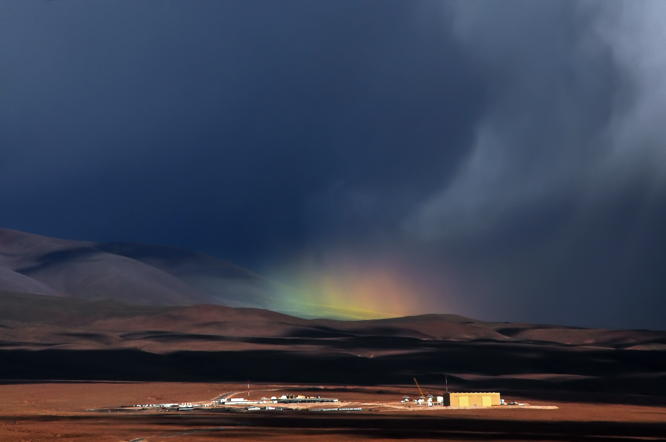 Alla pagina precedente, un raro arcobaleno sopra l’Operations Support Facility di Alma, che si trova a circa 2900 metri sul livello del mare, vicino a San Pedro de Atacama. Crediti: S. Otarola/Eso
