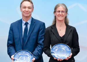Marta Burgay e Michael Kramer ricevono il premio “Frontier of Science Award” all’International Congress of Basic Science di Pechino. Crediti: Icbs